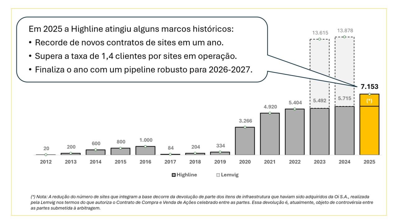 Fundada em 2012, a Highline desenvolve soluções de infraestrutura compartilhada como torres, postes, estruturas em topos de prédios para as operadoras de telefonia celular instalarem suas antenas. São mais de 7.500 pontos de infraestrutura em operação enquanto centenas de outros pontos estão em construção em todos os 27 estados brasileiros (Base: Dez 2025).